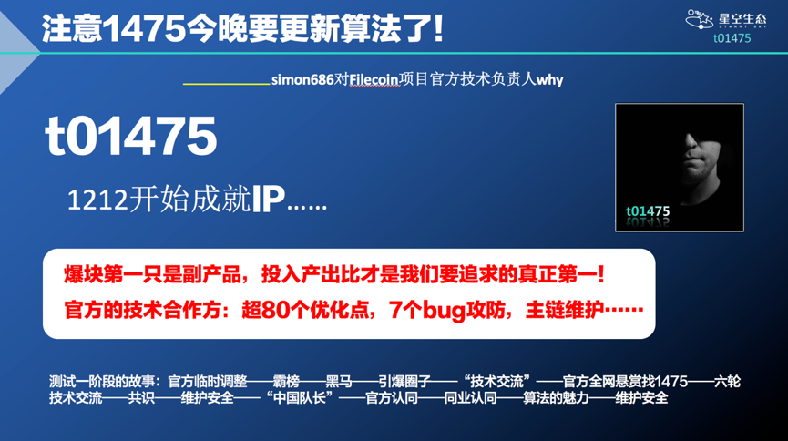 之后,Filecoin测试网因为系统Bug和攻击导致网络瘫痪,我们的技术团队,在两次非常关键的时刻成功的把主链“救”了回来,也从侧面验证了我们的技术方案,同时,这也成了一些技术社区热聊的话题,真的是经历了很多这样大大小小的事件,1475才一度成为Fileocin测试网的焦点。
