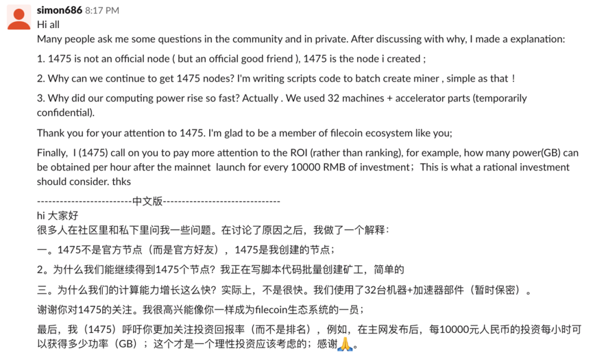 1475节点开始引起大家的关注,是因为Filecoin官方技术负责人Why突然在Slack上全网“悬赏”找我们,当时我们发现了一个重要Bug。