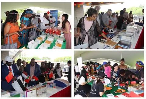 展览展示区,使馆多功能超大LED屏幕持续不断播放《欢乐春节》、《中国超乎你的想象》、《美丽中国》、《中国外交官眼中的南非》、国庆70周年阅兵仪式、70周年庆典晚会、中非合作纪录片《蒙内铁路》等视频节目,室外精心布置了新中国成立70周年图片展,让来宾们全方位感受到中国巨大发展成就和中南中非合作共赢的丰硕成果。