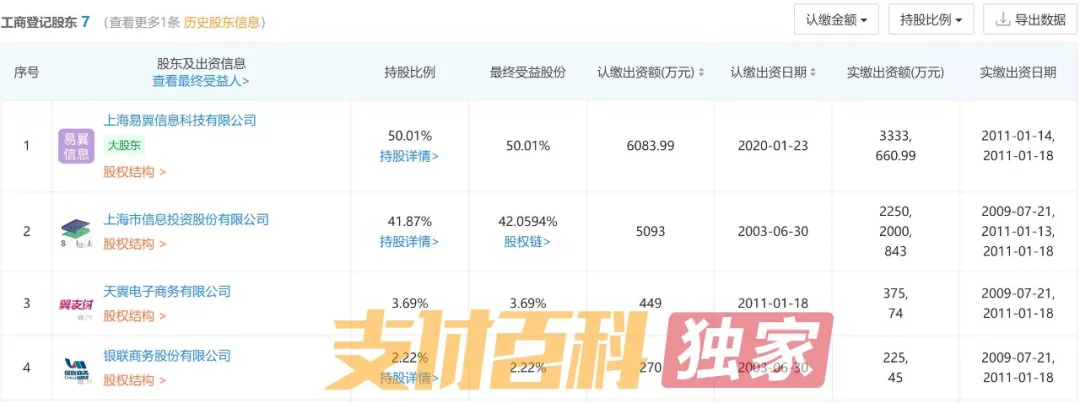 「支付百科」查询企查查得知,上海付费通信息服务有限公司更新了一条最新股东出资信息,2020年1月23日,上海易翼信息科技有限公司认缴出资6083.99万元,从而获得付费通50.01%的股权;上海市信息投资股份有限公司持有付费通41.87%的股权,为其第二大股东,其余股东中还包括天翼电子、银联商务等机构。