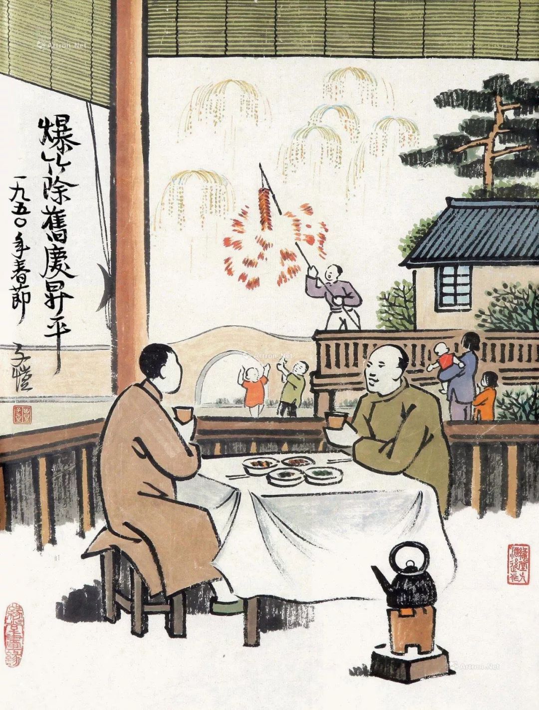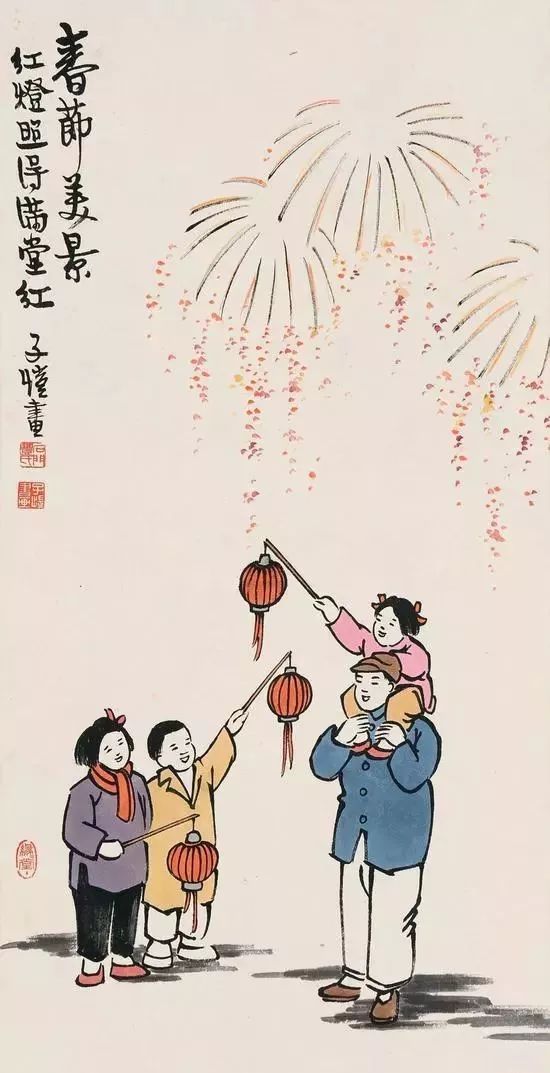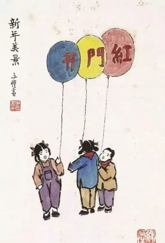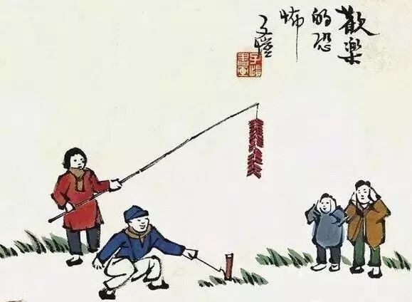 其中,万花筒最好看,然而价贵不易多得。买回去在天井里放,大可增加过年的喜气。我把一串鞭炮拆散,一个一个地放,点着了火,立刻拿一个罐头瓶来罩住,“咚”地一声,连罐头瓶也跳起来。我起初不敢拿在手里放,后来经乐生哥哥教导,竟敢拿在手里放了。两指轻轻捏住鞭炮的末端,一点上火,立刻把头旋向后面。渐渐老练了,即行若无事。