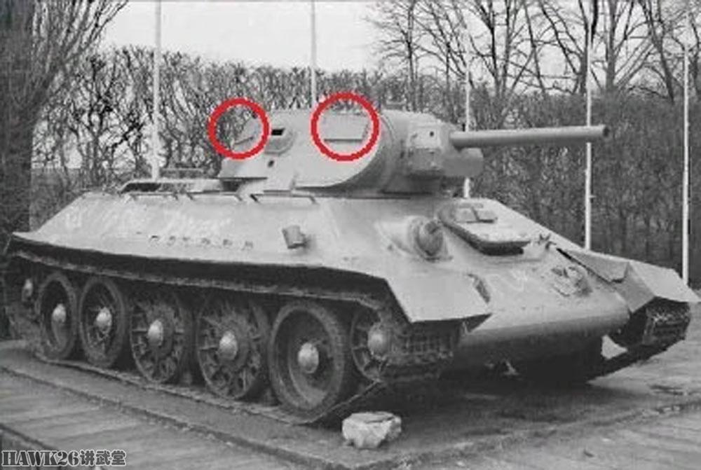 2. 炮塔侧面的矩形补丁。这是另一辆T-34 1941型坦克右侧至少被两枚炮弹击穿,都用矩形钢板焊接,形成两块补丁。