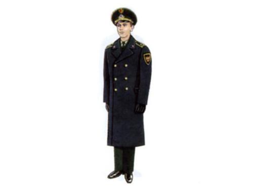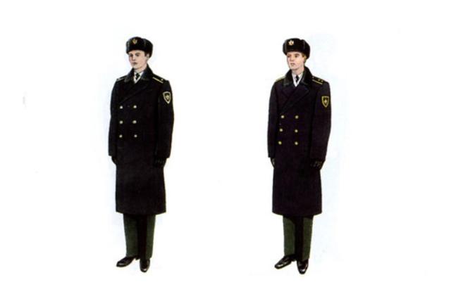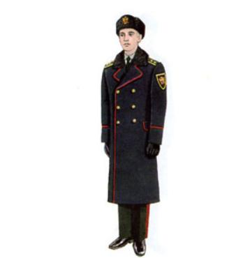 这是俄罗斯联邦税务警察局的冬装大衣,配备棉帽,黑色棉皮鞋。护耳棉帽非常讲究,高级、中级和初级警员帽子的皮革材质不同,初级警员的最差,仅为熟羊皮,高级领导的是黑羔羊皮。