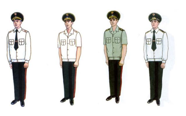 今天,我们就通过一组图集,来看看俄罗斯联邦税务警察局的制服体系。这是最高级管理人员的礼服和夏常服,灰绿色的羊毛大檐帽,礼服肩章和领花都用了金色的编织绳,灰绿色裤子带红色缝饰,白色衬衫可带肩章,灰绿色领带,金黄色领带夹。黑色半腰皮鞋。