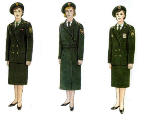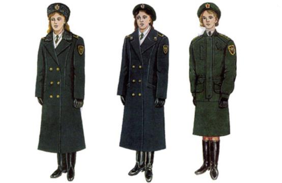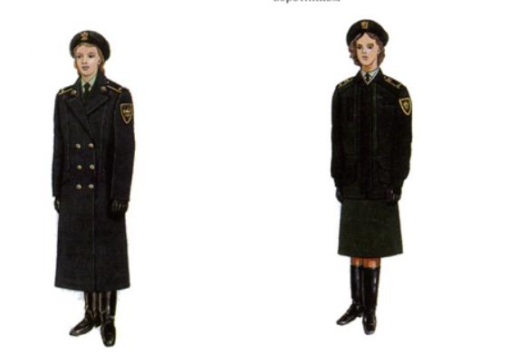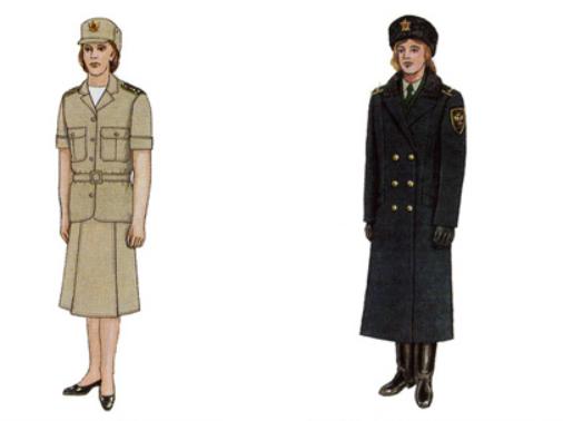 女警官米色棉布长檐软帽,带肩章的短袖上衣加裙子,内衣为白色T恤衫。右侧为女警官冬装大衣配棉靴和棉帽。