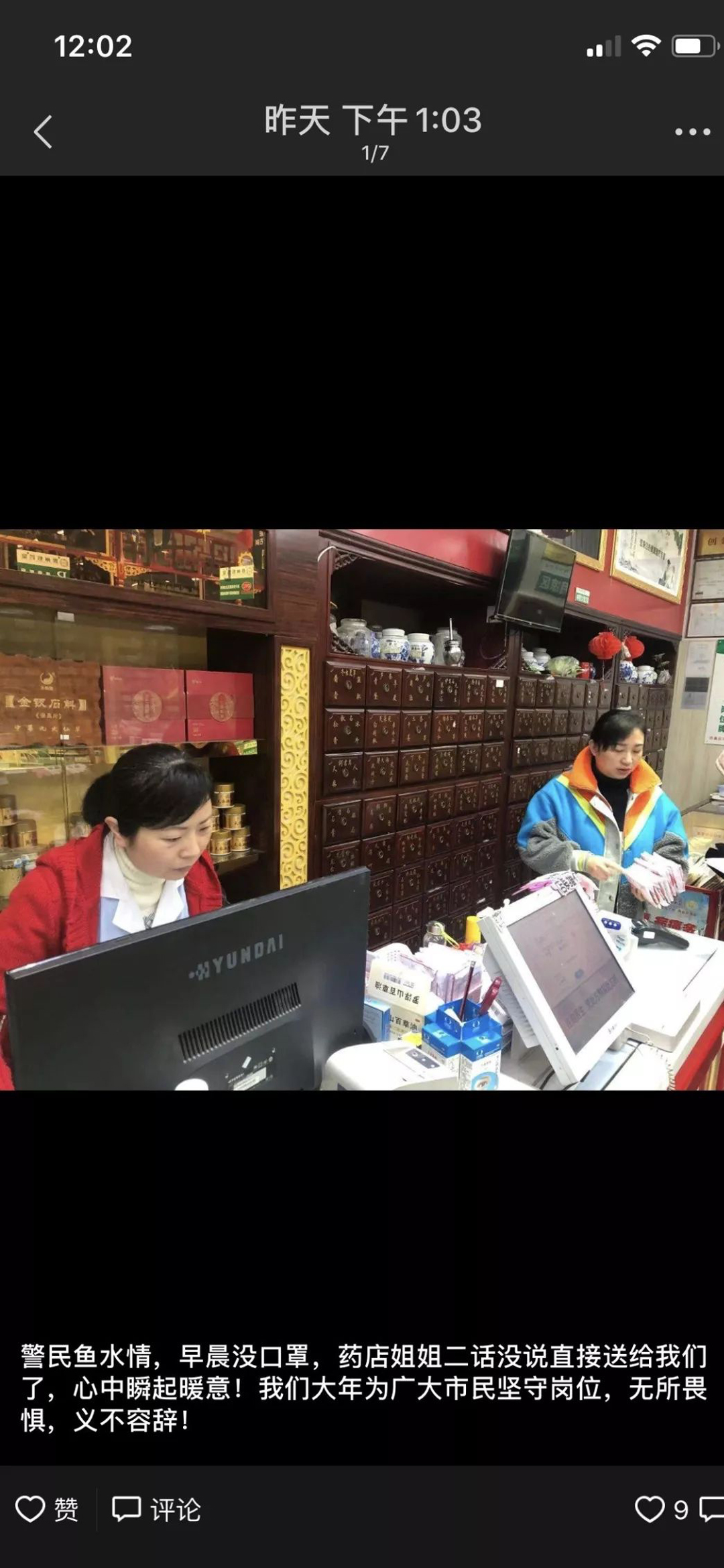 民警准备把钱拿给工作人员,但她们始终都不肯收,并说你们工作在一线,一定要保护好自己。事后,交警郭禹庭在朋友圈写下这么一句话:警民鱼水情,药店姐姐二话没说直接将口罩送给我们,心中瞬起暖意!我们为广大市民坚守岗位,无所畏惧,义不容辞!