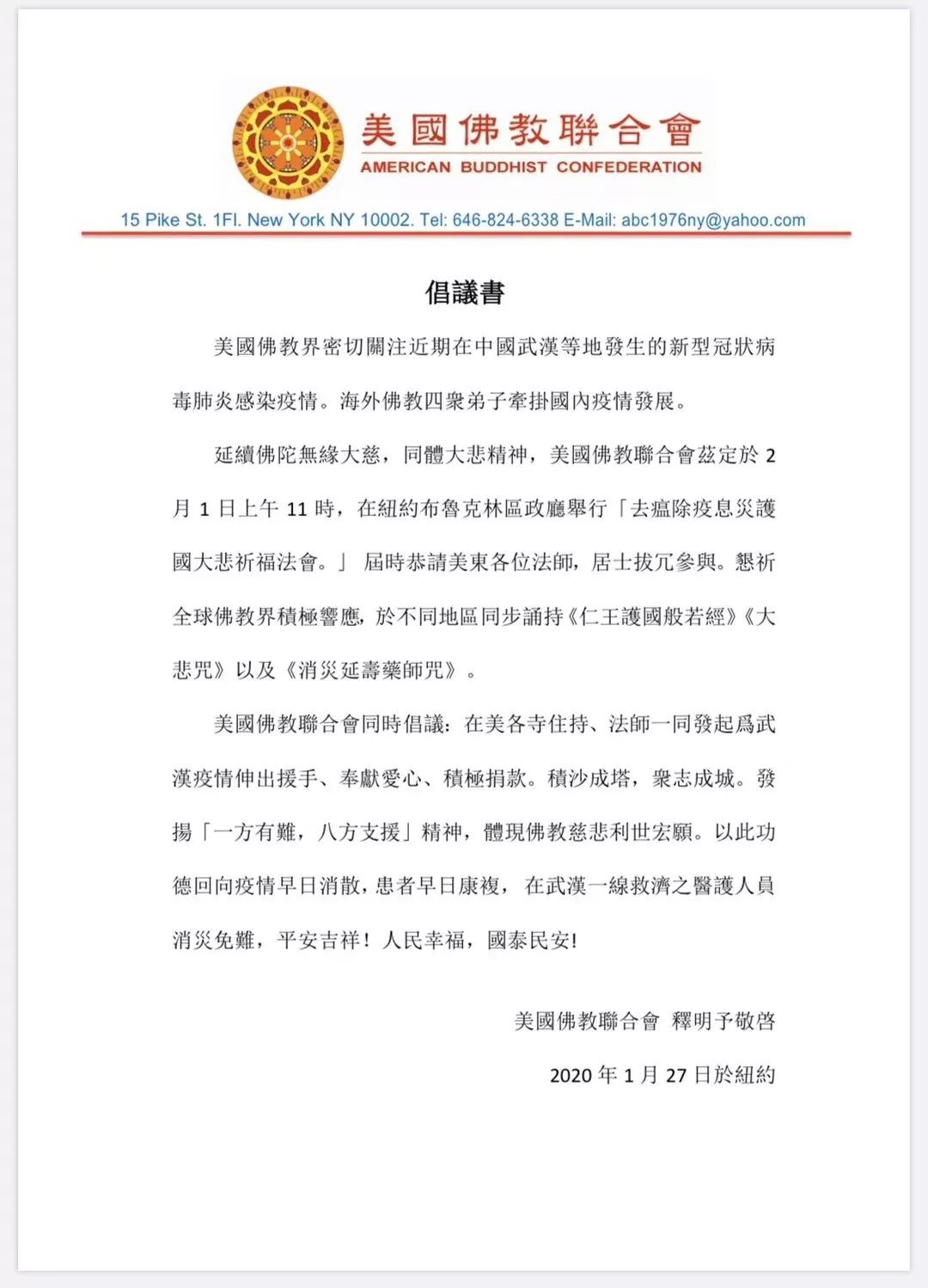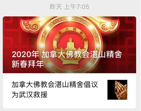 加拿大佛教会湛山精舍微信公号北京时间1月24日上午7:05发布文章《加拿大佛教会湛山精舍倡议为武汉救援》,捐赠人民币20万元,购买口罩和急需物品送给武汉需要的人群; 倡议全人类动员起来,拒绝吃任何野味,还给大自然一片安宁和祥和。