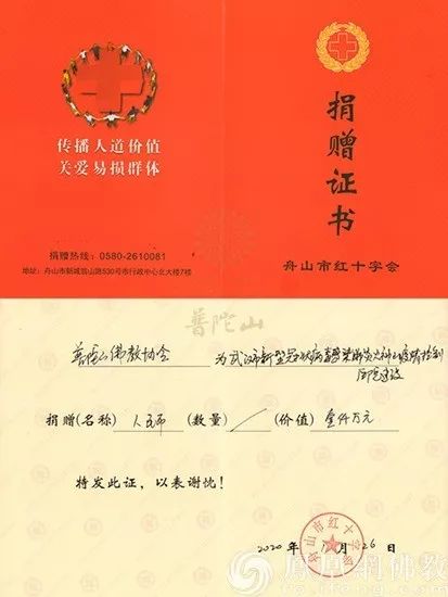 2020年1月25日晚8时,中国佛教协会副会长、普陀山佛教协会会长、中国佛学院普陀山学院院长、普济禅寺方丈道慈大和尚与佛协领导班子召开紧急会议,研究决定普陀山佛教协会捐赠1000万元,意愿将善款专项用于武汉火神山医院建设,尽普陀山佛教协会的一份力量。