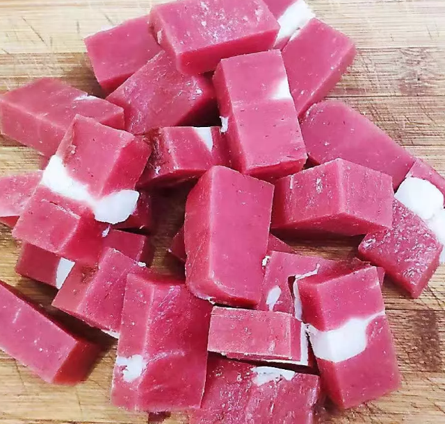 年糕自带迷人的味道,通体白嫩,像一个赤裸的小婊砸,不知不觉就勾引你多吃两块。既然年糕这么好吃,为什么平时见得不多?真的是因为“年糕”是新年的食物么?在江南地区,我们新年最常见的年糕大多是上面这种猪油年糕,吃的时候切成片或者条状,往往先裹挟一层蛋液,然后下过油炸。由于制作过程里油很少,所以多吃一点也不会腻,就可以平时作为主食来吃。话不多说,今天大叔下厨房教你做玫瑰年糕春卷,希望你吃得开心呢~