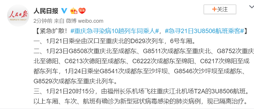 以上车厢、车次、航班有确诊为新型冠状病毒感染的肺炎病例,现已隔离治疗。