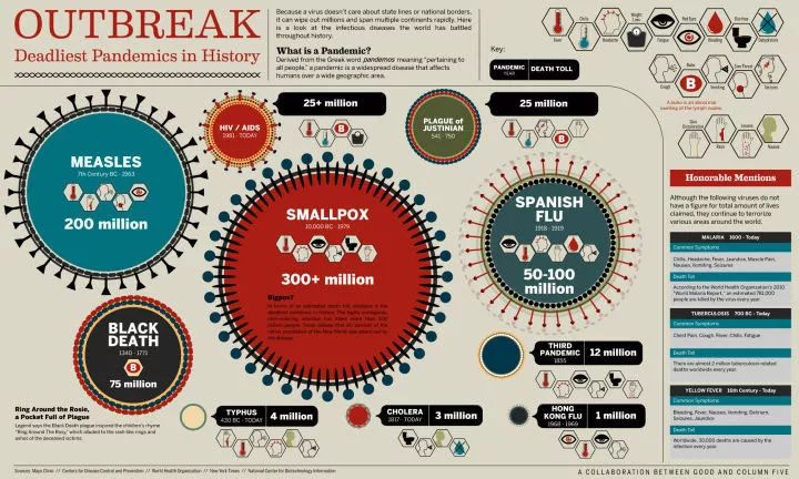 人类历史上杀人最多的4种传染病:Smallpox——天花、measles——麻疹、flu——流感、black death——黑死病即鼠疫,单位为百万,鼠疫其实不是杀人最多的,毕竟还是效力太猛了。