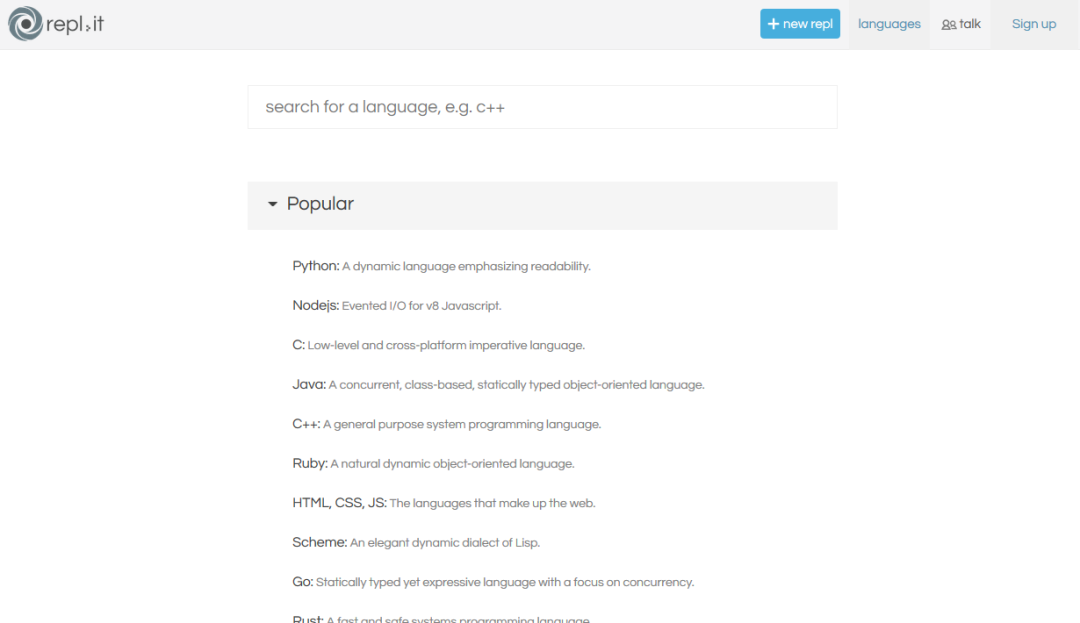 网站地址:https://repl.it/languages