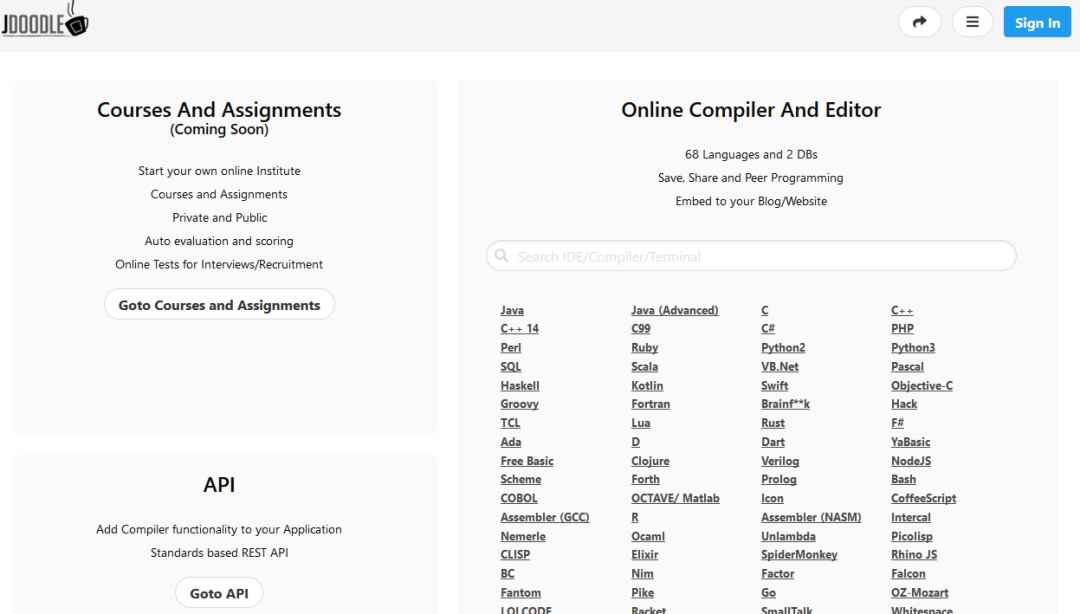 Ideone是C / C ++,Java,PHP,Python,Perl和40+编译器和解释器,支持其他的60种语言。这个工具提供许多强大的功能,允许程序员快速高效的编译源代码。在编写轻量级代码的时候 再也不用考虑本地开发环境的搭建了