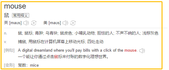 mouse大家都很熟悉了,一般指的是一种可爱的小动物,宠物鼠之类的,Micky Mouse是我们从小看到大的卡通人物。mouse是单数,mice是复数。