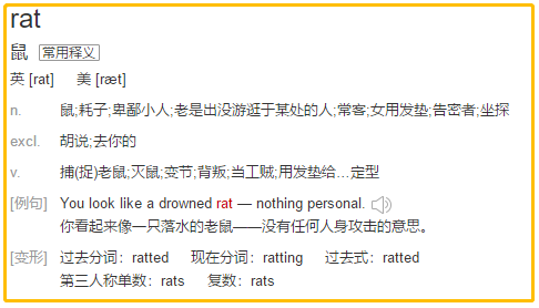 rat有负面含义。作名词的时候,指代一个人"卑鄙;奸诈;小人",电影里经常把对手组织安排在自己这边的卧底称为rat;rat还可以作动词,表示 “背叛;告密”。