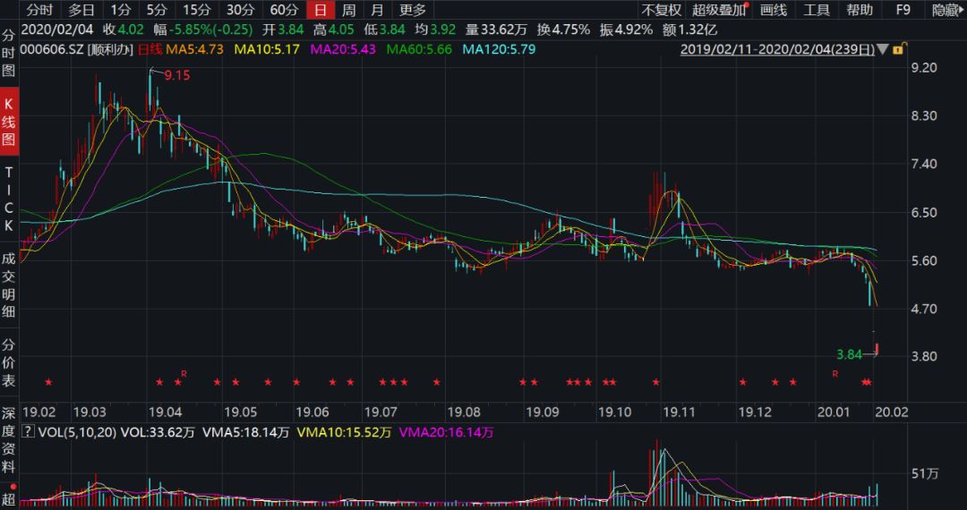 Wind数据显示,1月23日、2月3日,顺利办连续两个跌停,2月4日下跌5.85%,收报于4.02元,当日盘中创下近10年以来的最低价。