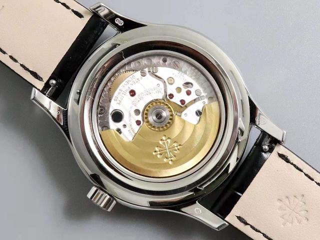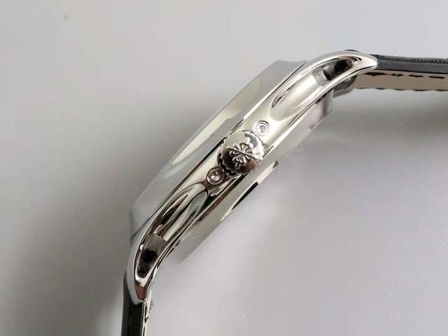 表冠同样采用316L精钢打造,表冠侧面做了齿轮状设计增加了上链手感,表冠顶部刻有百达翡丽独家logo标识,凸显尊贵身份。