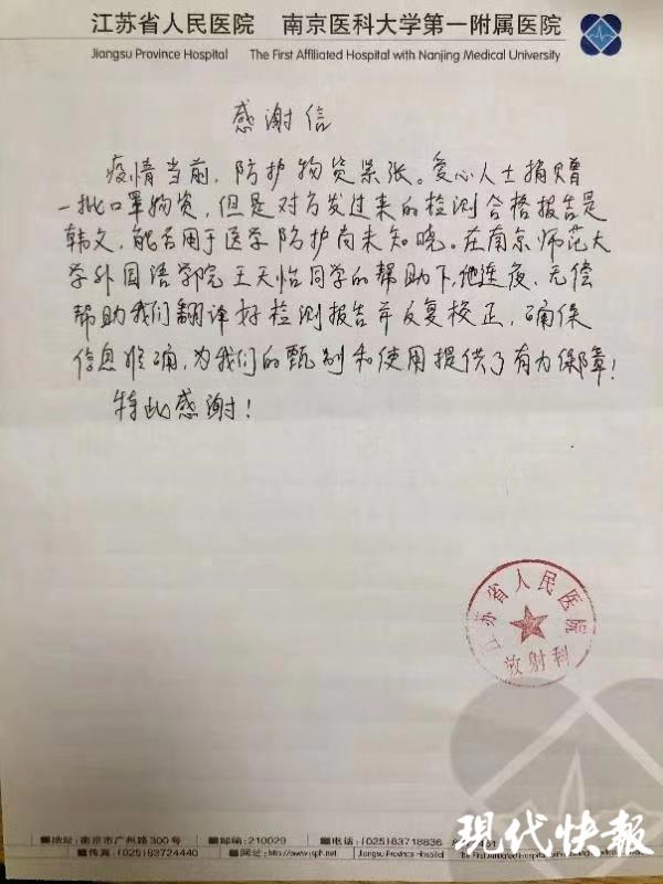 现代快报讯 "疫情当前,防护物资紧张,爱心人士捐赠一批口罩物资,但是对方发过来的检测合格报告是韩文。在王天怡同学的帮助下,她连夜无偿帮助我们翻译好检测报告并反复校正,确保信息准确,为我们的甄别和使用提供了有力保障 …… " 2 月 4 日,南京师范大学外国语学院收到江苏省人民医院的感谢信,向学院学生王天怡连夜翻译捐赠物资检测报告致谢。外国语学院院长严志军收信之后由衷地说:"感动!为我们的学生自豪!"