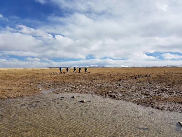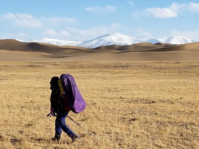 10月2日下午,我和队友乘车到达库木库里沙漠东缘附近,车辆再也无法继续前行的时候,我们便下车,纷纷背上装备,往西行进,目的地是库木库里沙漠。据地图显示,我们和目的地的直线距离大约10公里,原以为很容易就可以到达,但实际上却走得比较艰难。这一是因为大家刚从车上下来,身体都需要适应环境,二则是因为部分队友出现了轻微的高反现象。库木库里沙漠的海拔在3900~4700米之间,是世界上海拔最高的沙漠,而我们行进之处已经达到海拔4000多米。
