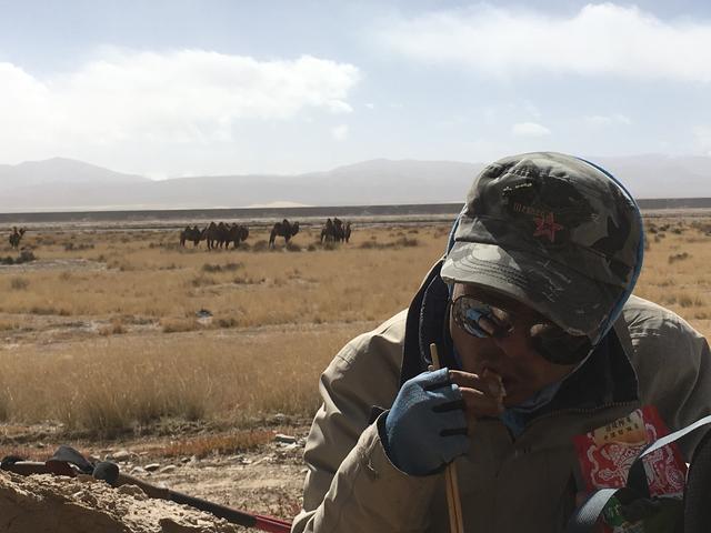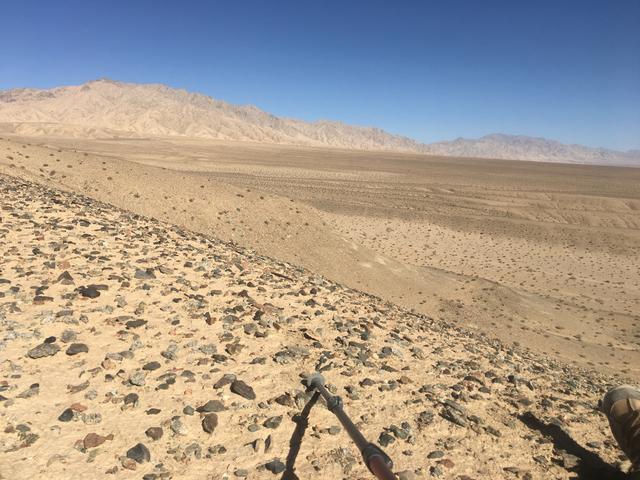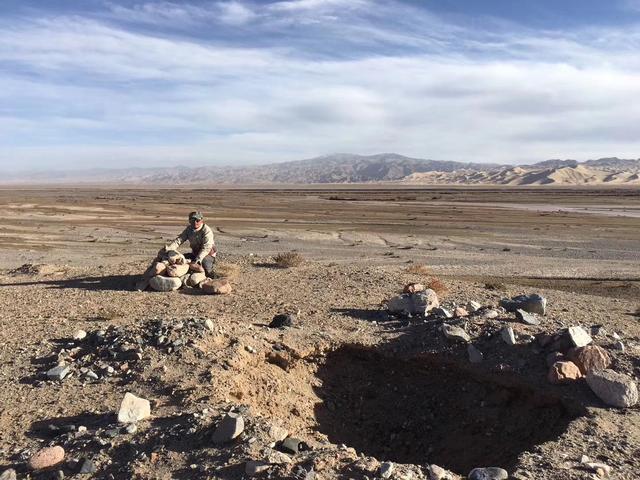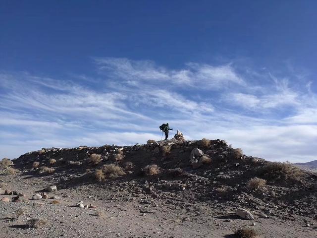 相安无事地过了一天,途中在辽阔荒原上我看到一个突兀的平台,疑似祭台或戏台,平台上面有两个大坑,应该是有人来此“挖宝”留下的痕迹。从周边地形来看,几乎可以排除平台乃天然形成的可能性,这也就意味着,这个区域曾经有人类在附近居住或活动过。后来回到北京,根据定位,我发现这里和死亡谷东边的临界点“布伦台”的位置大致相近,不知道它是否就是“布伦台”。