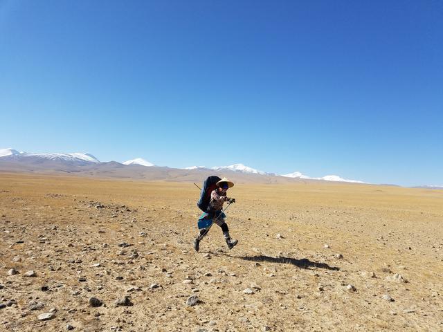 不知从何时起,风逐渐变大了,狂风夹杂着砂石,逐渐弥漫了一部分天空。尤其是河对岸的右后方,沙尘暴像墙一般矗立在不远处。那正是“引刀”所在的位置!眼看着河对岸的沙尘暴越来越大,动物成群结对地飞奔离去,队友的身影也消失了。此时,我们的前方却是晴空万里,能见度还不错,甚至能看清楚远处的雪山,似乎我们恰好处在沙尘暴的边缘地带。我用卫星通讯设备也联系不上“引刀”,最后我以登山杖为旗杆,举起一面鲜红的大旗,所有的队友都停下来等待,等待沙尘暴消失,更等待离群的队友回归。