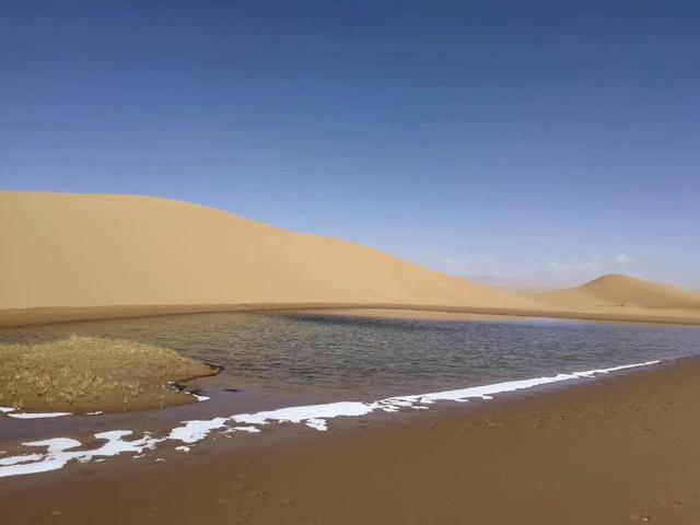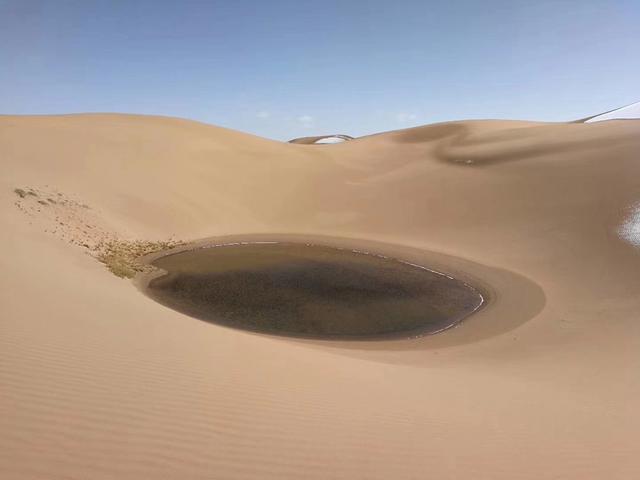 沙子泉是茫茫沙漠中一汪碧蓝的清泉,泉水从沙山脚下喷涌而出,泉口直径达200米。与周边荒凉的黄沙环境不同,泉水四周绿意盎然,水草生机勃勃,堪称库木库里沙漠的奇景,同时也是野生动物的天然饮水地。下午3点左右,我和“好人”回到营地,吃了几口队友们煮的面条,一股舒适感贯彻全身。