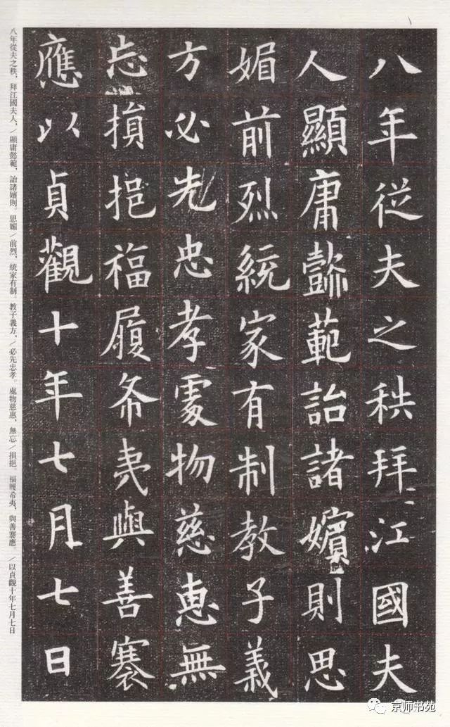 八年从夫之秩,拜江国夫人,显庸懿范,诒诸嫔则。思媚前烈,统家有制。教子义方,必先忠孝。处物慈惠,无忘损挹。福履希夷,与善褰应。以贞观十年七月七日