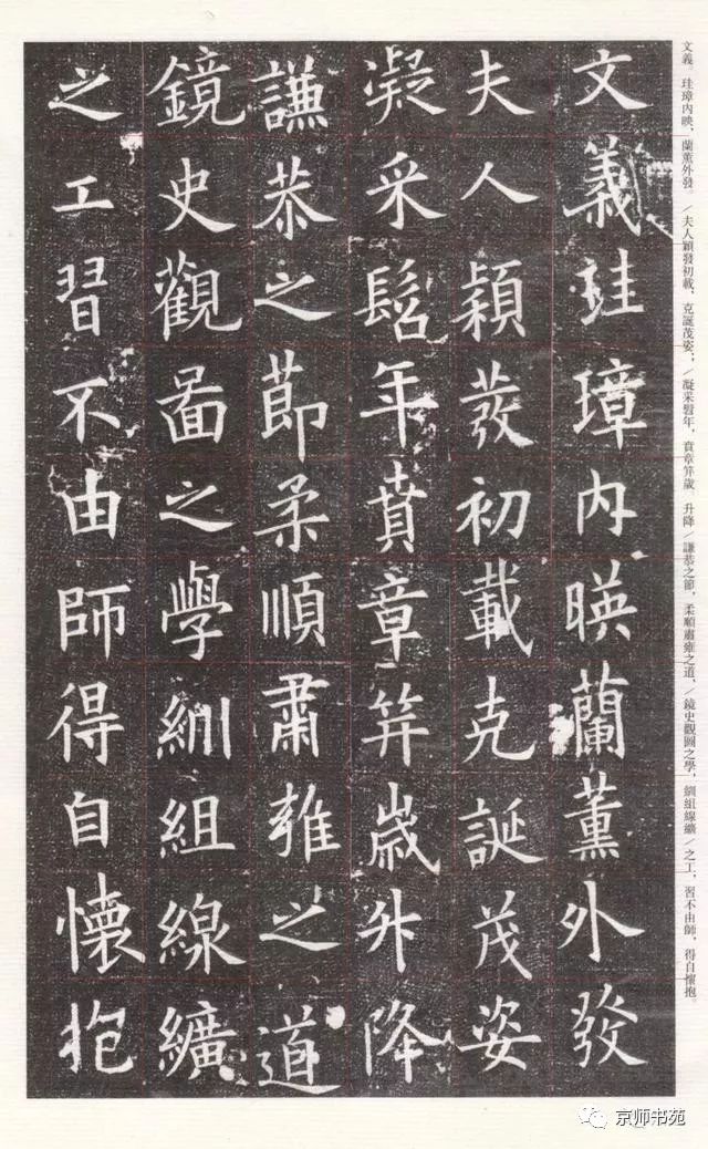 文义。珪璋内映,兰薰外发。夫人颖发初载,克诞茂姿;凝采髫年,贲章笄岁。升降谦恭之节,柔顺肃雍之道,镜史观图之学,紃组线纩之工,习不由师,得自怀抱。