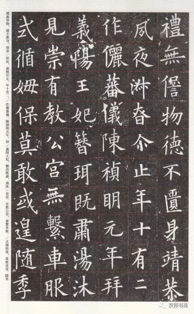 礼无諐(愆)物,德不匮身。靖恭夙夜,淑昚(慎)尔止。年十有二,作俪蕃仪。陈祯明元年,拜义阳王妃,簪珥既肃,汤沐见崇。有教公宫,无系车服。式循姆保,莫敢或遑。随季