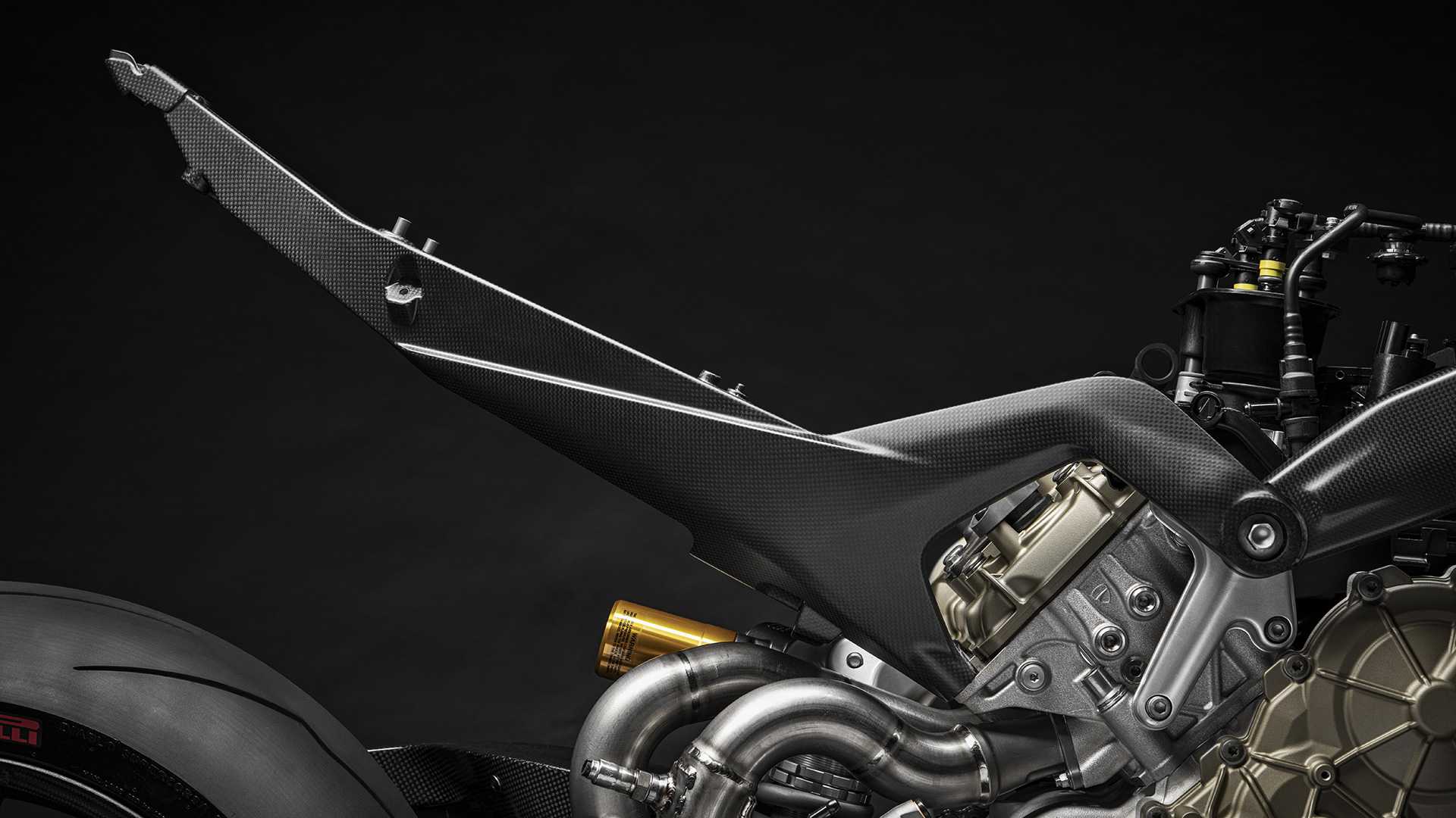 采用特殊材质的部件包括,副车架,小翼,后把手,轮圈和离合器盖等,均由碳纤维制成。