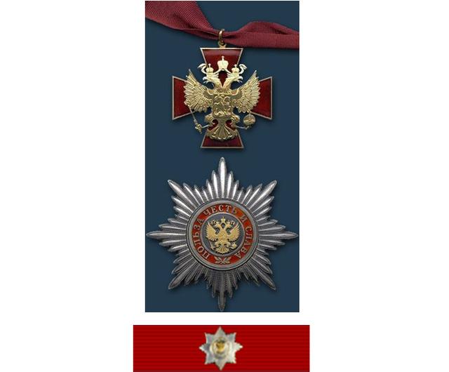 星章,八角形,直径82毫米,银质抛光,正面中央圆形上刻有俄罗斯联邦的浮雕镀金国徽。徽章周围红色珐琅镌刻“利益、荣誉、荣耀”(俄文:ПОЛЬЗА, ЧЕСТЬ И СЛАВА。下臂背面刻有勋章序列号。