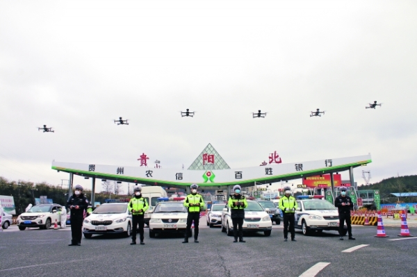 2月6日,贵阳交警高速支队启用多架无人机进行播报指导宣传,协助疫情检查点准确完成体温监测等工作,避免进入贵阳北收费站的车辆长时间排队等候。
