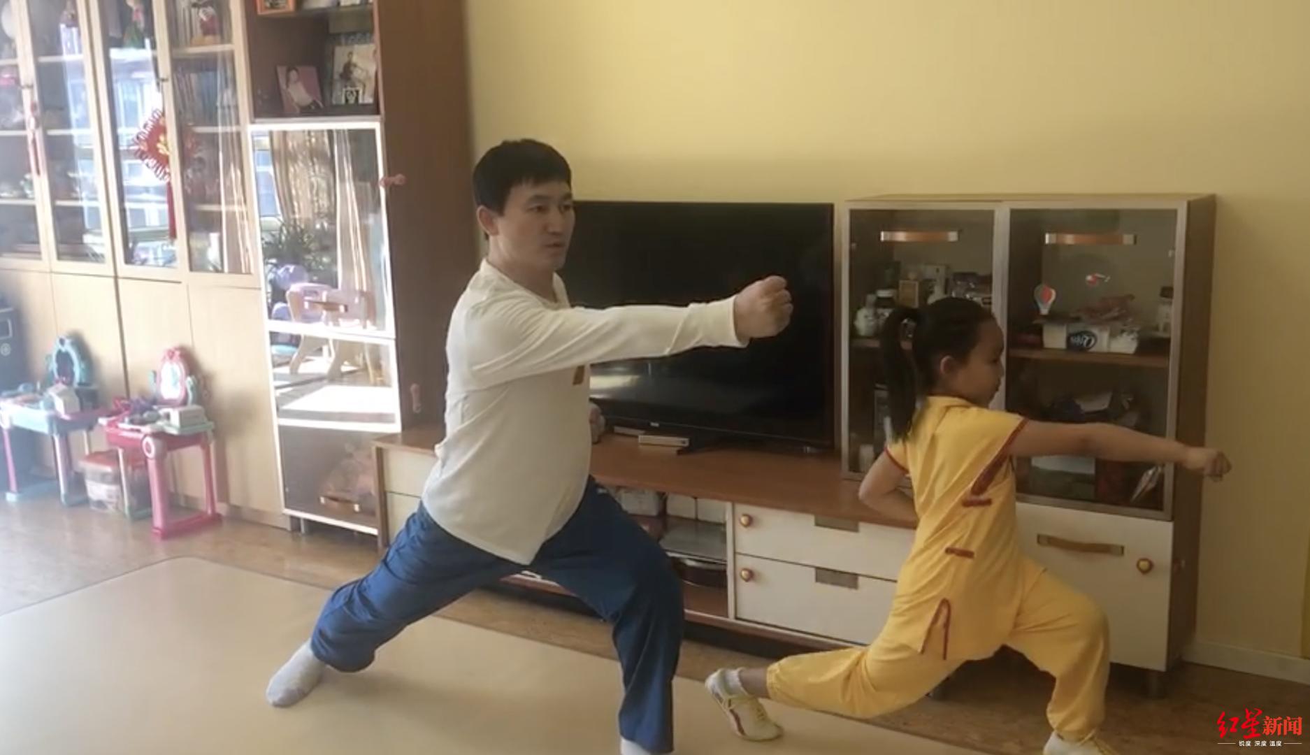 在进行完“开合跳”热身之后,赵庆建给大家示范了两套长拳的基本动作,“这两套动作适合和家人一起做,有很好健身效果。”视频中,每一个动作赵庆建作为详细的分解,在一旁跟着做动作的女儿也非常认真,还穿着传统武术服装。赵庆建补充道,等这个动作熟练以后,可以慢慢加一些速度和力量进去,起到更好的健身效果。