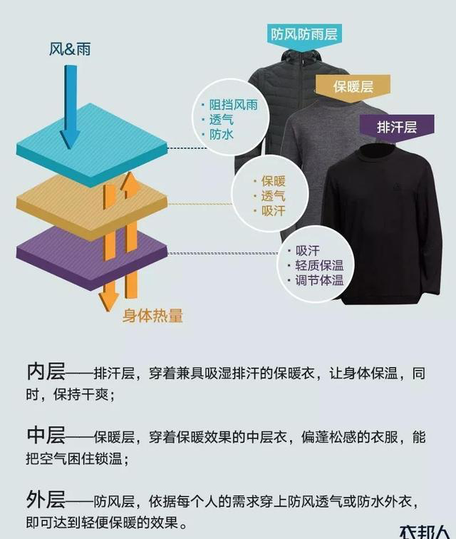 这个“三明治”穿法就是指,通过内排、外防、中保暖,打造三层防护。每一层的材质选择都尤为重要!