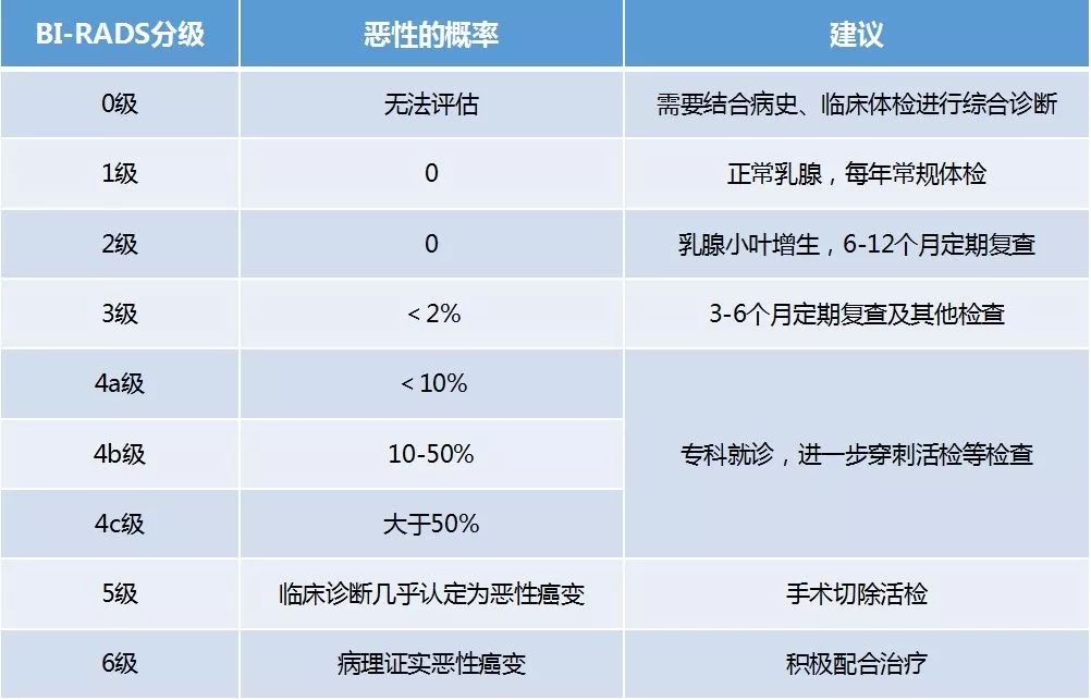 在明确这三种病变特征后,医护人员就可以根据这些征象进行总体评估分级,乳腺BI-RADS分级是一种乳腺影像诊断分类评估方法,共分为6级,诊断标准如下: