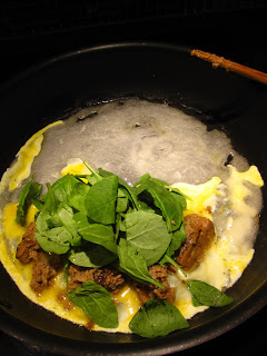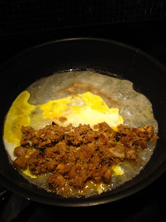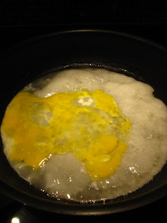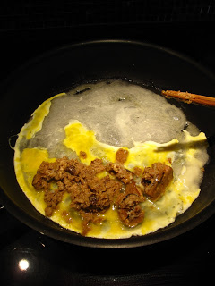 然后加入打散的鸡蛋(旁边的皮变成透明状,看起来很好吃的样子)