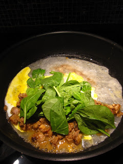 第二次再挑战,地瓜粉和水的比例一样,只是再加了一大匙的玉米粉(太白粉也可) 煎皮的外表看起来没有什么太大的差别,这次学乖了,肉燥少放一点