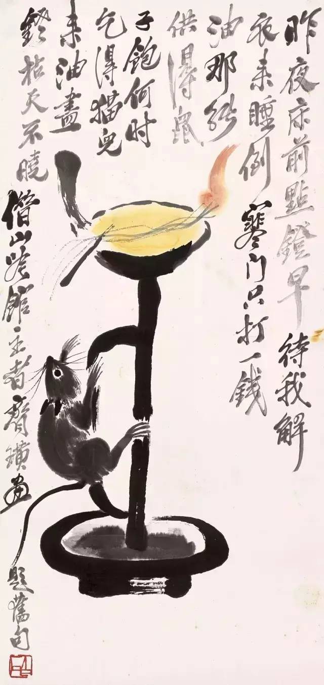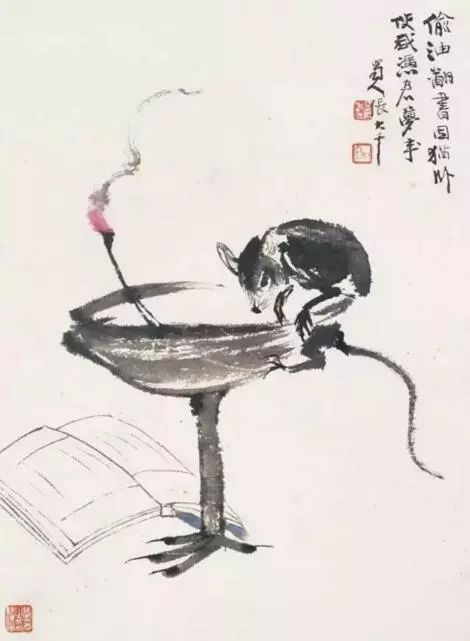 齐白石刚到北京时,穷困潦倒,为了生存,不得不卖画度日。一日,他画了一幅《小鼠翻灯》:一只小老鼠在油灯下,抬头望着盛油的灯盏,一副贪婪的模样。作诗云:“昨夜床前点灯早,待我解衣来睡倒。寒门只打一钱油,哪能供得鼠子饱。何时乞得猫儿来,油尽灯枯天不晓。”他把老鼠偷灯油比作贪官污吏的横征暴敛,把猫儿治鼠比作有朝一日贪官污吏绝迹,耐人寻味。