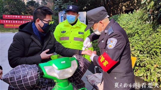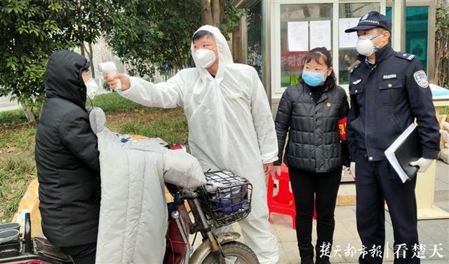 江汉区交通大队交警协警,参与唐家墩街马场社区小区对出入人员量体温