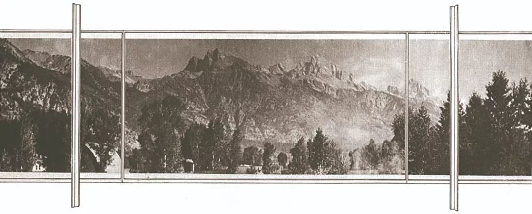 风景介入的拼贴在见证密斯将自然风景转型为审美之物的同时,也明确了空间定义:即使空间克制到一无所有,依然强烈地宣告它与自然的关系。在密斯抵达美国的同一年,美国艺术家斯图尔特·戴维斯(Stuart Davis)创作了 《摇摆的风景》(Swing Landscape,1938),这幅绘画融合了美国摇摆音乐与自然风景元素。在此,我们无意强行赋予这幅作品和密斯拼贴之间的关联性,但从中可以发现美国现代艺术和建筑的风景意识的同时觉醒。由此可以推断,密斯对风景的提取绝非偶然。