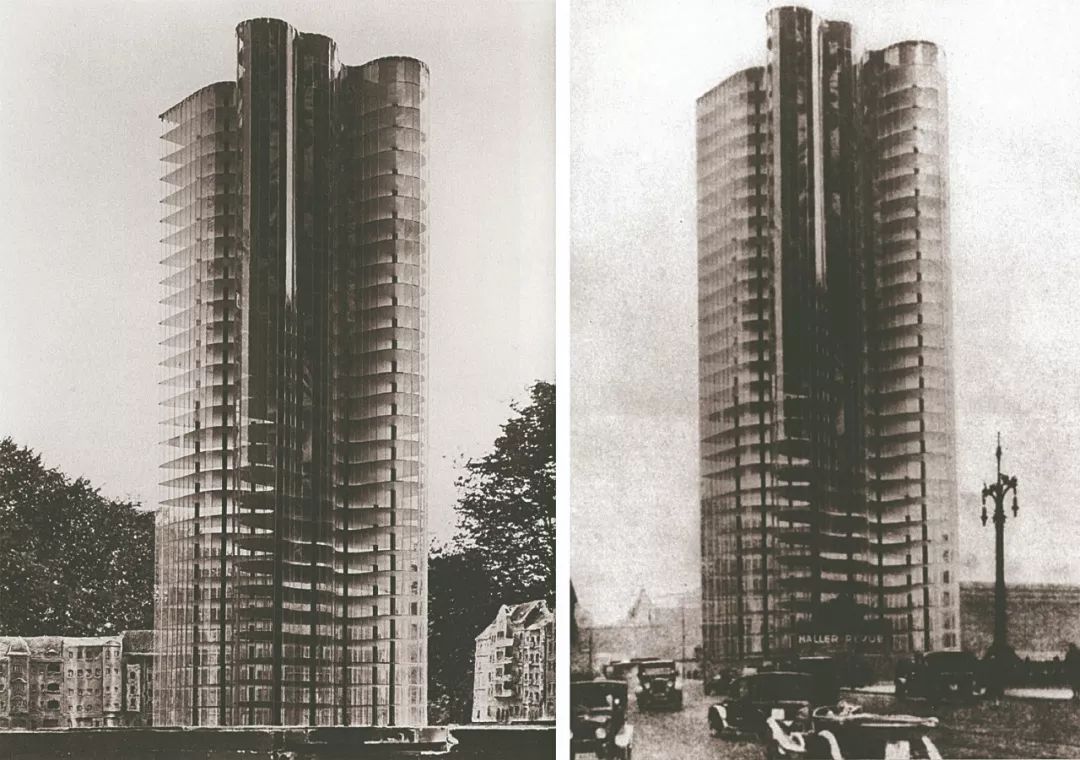 在柏林高层玻璃大厦(Glass Skyscraper Project,1922)设计中,密斯彻底地放弃了传统建筑透视图的绘制方式,将曲线建筑的模型照片直接与环境影像拼贴在一起,让人联想起同时代德国导演汉斯·珀尔齐希(Hans Poelzig)的电影《魔像》(Golem,1920)中的表现主义风格建筑。该拼贴至少有两个版本:将摩天楼与周围住宅置于树林之前和置于车水马龙的城市街道,由此拼贴成为密斯研究建筑形体与环境关系的一种直观工具。“密斯精心地使用照片拼贴来增强甚至取代他的大画幅彩色表现图,来促进构筑与场所的合成效果,利用摄影的真实性创造一种整体印象。”