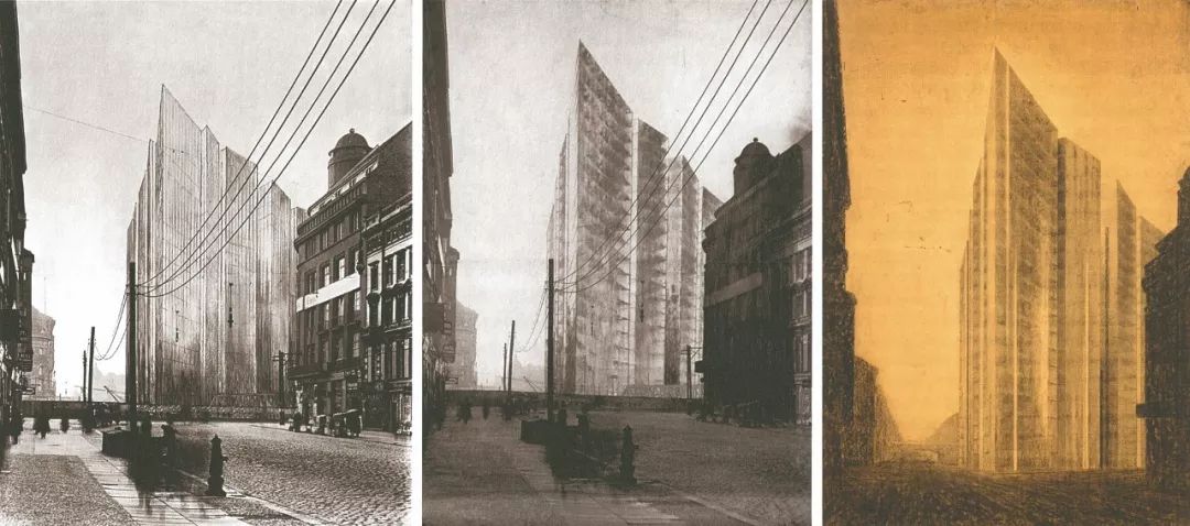 | 绘图+照片拼贴 | 1922 | 弗里特里希大街高层办公楼 | 按照环境照片的角度绘制建筑设计透视图,将绘图与照片拼贴,表达真实环境中的建筑效果 |