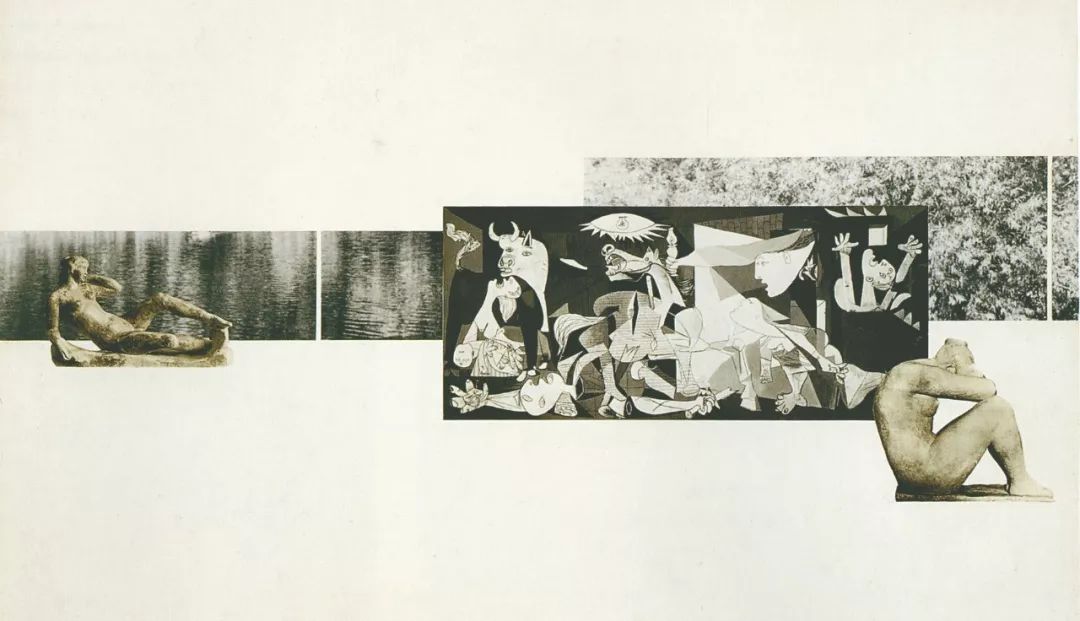 1942年,受《建筑论坛》(Architectural Forum)杂志的委托,密斯完成了小城博物馆(Museum for a Small City)的概念设计,他以一张前所未有的拼贴呈现了想象中的博物馆室内空间: 抹去之前的全部建筑绘图元素,整张拼贴由风景(水面、树林)、毕加索的反战绘画《格尔尼卡》(Guernica)、阿里斯蒂德·马约尔(Aristide Mailllol)的两座雕塑照片构成,风景照片中的白缝暗示着落地玻璃的存在,也暗示着室内与室外的分界。 尽管没有任何建筑构件、地面和天花,但由绘画(艺术)、雕像(人)、风景(自然)构成的空间叠加依然产生了强烈的透视感。 这张拼贴融合了自然、艺术、空间,将影像艺术的片段构成空间元素之叠加,既混合了抽象表现主义的内涵和施维特斯拼贴的某些特征,也构成了密斯“通用空间”的早期萌芽。