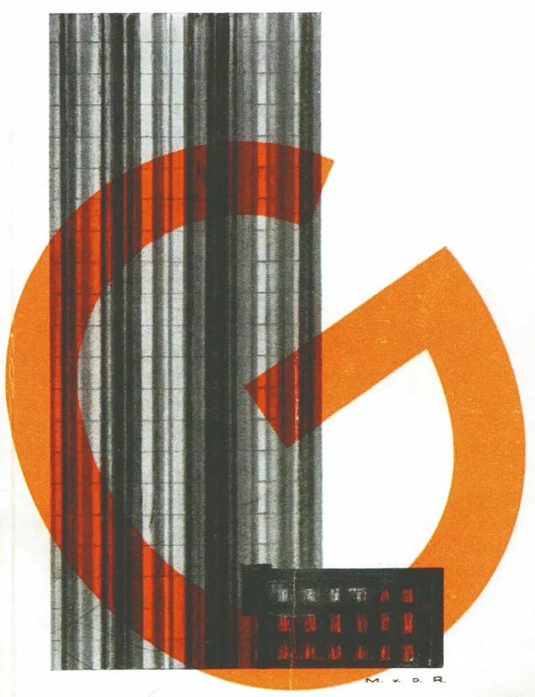 和勒·柯布西耶相似,密斯深知塑造自己作为现代先锋建筑师公众形象的重要性,为此,他在自己的展览和出版物中精心创造印象深刻的建筑表达。1923年,密斯成为柏林G(Gestaltung)小组的创始成员之一,与汉斯·里希特、凡·杜斯堡(Theo van Doesburg)等共同负责G杂志(G:Material zur elementaren Gestaltung)的出版。该小组宣扬对“形式主义”的抵制,并在新客观性(New Objectivity)的旗帜下,支持那些与实用性和建造紧密相关的形式。1924年密斯资助并编辑了第三期《创作》(Review G),在封面设计中,密斯将建筑立面的炭笔画与斜向动感的红色字母G拼贴在一起,几乎看不出绘图与文字的叠加顺序,两者呈现同样的透明质感,利西茨基(El Lissitzky)将之称为“语言与图形之间的动态的、辩证的逻辑性共振”。尽管这些表现手段表明密斯在探求一种人视角度的夸张表现,但他又以炭笔画立面抛弃了真实模拟视角,而将建筑视为视觉性的抽象构筑,从周围环境中蜃景般地升腾而起。“通过拼贴和重新制作的方式,密斯建立了一种个人化的建筑表现媒介。显而易见,他的目的不是照片写实主义的模拟,而是一种风格强烈的设计图像。”