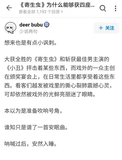 简而言之,在艺术和商业上做到了近乎完美的平衡和统一,口碑和声望,都是王者之势; 当时我看了这部电影3遍,依然感叹导演的叙事功力,故事背后带出的隐喻振聋发聩;之前我已经写过《寄生虫》的影评: