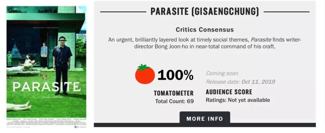 销往欧美亚洲等202个国家,法国,越南,澳大利亚等地均破韩片在当地的最高票房记录。 时至今日,烂番茄依旧保持在100%。