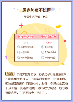 美柚大数据显示,防疫是孕妈的生活主线。在防疫相关热词中,“新型冠状病毒、防疫新闻、预防新型肺炎”问鼎TOP3。此外,孕妈的生活也十分丰富,如看影视剧、春节联欢晚会、地方春节晚会等,生活不缺少“色彩”。