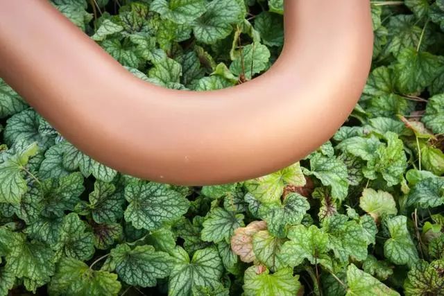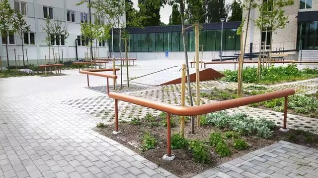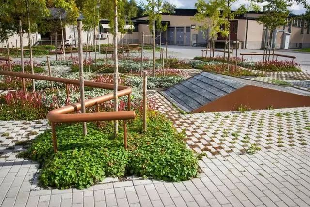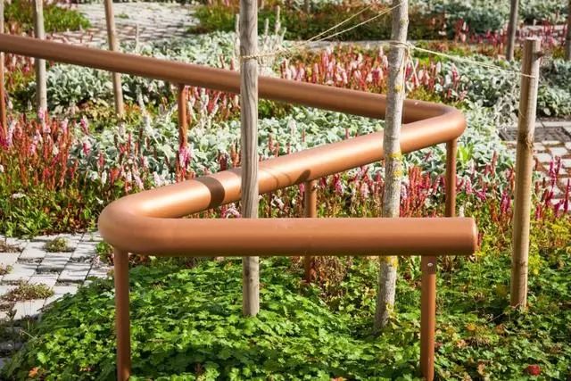 在软硬铺装结合的基础上,植物区与纯铺装的阻拦部分采用铜色管状阻隔物。 铜色是温暖的颜色,有利于患者心理的康复,此处它阻隔物的转角处采用弧状,避免尖锐的地方出现,增加包容性,提供温暖。