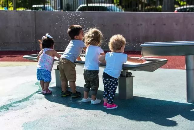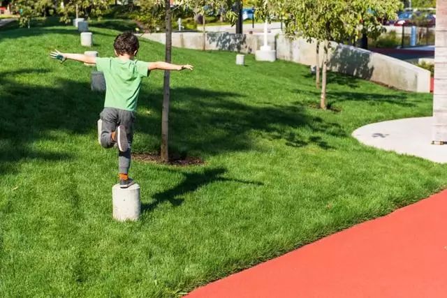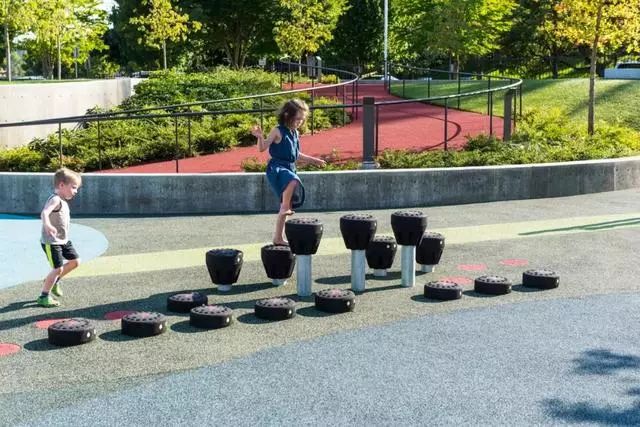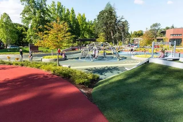 定制的游乐元素包括攀爬结构,无障碍滑梯,专业秋千,旋转器,跳楼梯,感官元素和协作水上游戏。 操场周围环绕着一条蛇形轨道,为患者提供了一条可以建立运动技能的通道。 砖拱和解说板纪念俄勒冈盲人学校曾经占据过这个地方。