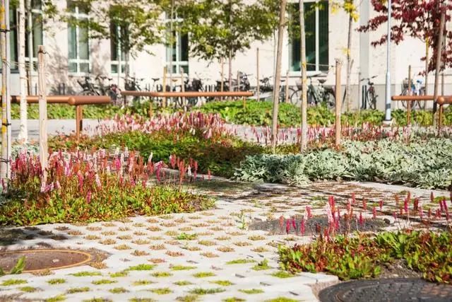 位于主入口处的植物园广场种植了多种树木,连同种植的铺路路缝、戏谑的树木和水等元素,共同构成了一幅美丽的画卷。 入口将铺路转变成绿色的广场,在不影响医院车辆出入的同时,让它发挥了户外活动的价值。